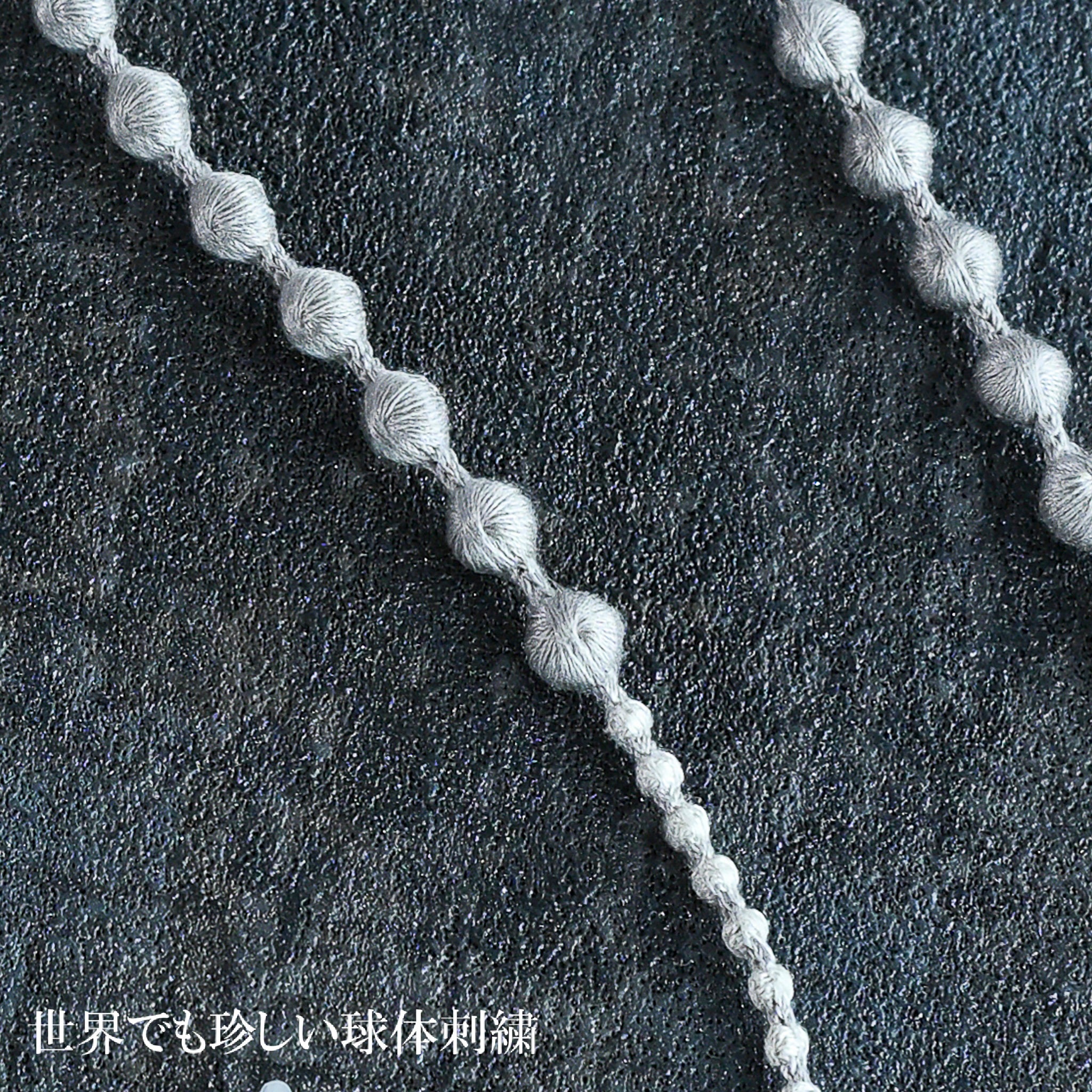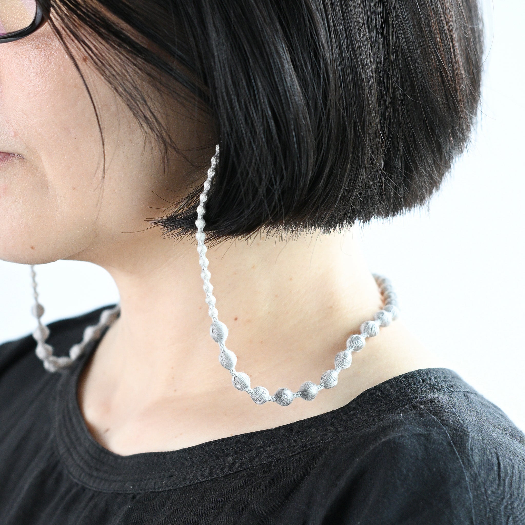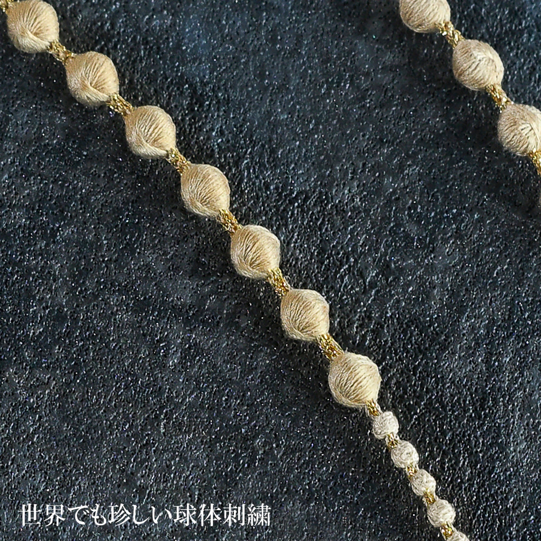 肩がこらない、かゆくない!の感動を145 年の歴史を持つ刺繍メーカーが、伝統技術に新たな発想を掛け合わせて生み出したアクセサリーシリーズ。金属を使わず、繊細なラメ糸の輝きをそのままに、肌にやさしい植物性の糸〝キュプラ〟を採用。チクチクしない着け心地と、軽さで長時間の着用も快適です。季節を問わず使えるシンプルなデザインなので、日常使いから特別なシーンまで幅広く活躍。刺繍職人の技術と感性が光る、こだわりのアクセサリーをぜひお試しくだい。◆◆作り手のこだわり◆◆デザイナー・片倉洋一さん(トリプル・オゥ)「肌にやさしく、軽く、洗えて、修理もできる」という4 つの〝やさしさ〞を軸に製品作りをしています。代表的な製品のひとつが、糸で作る立体的なパール風ネックレスです。2 年にわたる試行錯誤の末にたどり着いた独自技術で、世界でも珍しい球体刺繍を実現しました。●植物性の糸「キュプラ」を使用した、世界でも珍しい球体刺繍(ウッドベージュのみ間にラメ糸を使用しています)●重さわずか6gで肩がこらない!