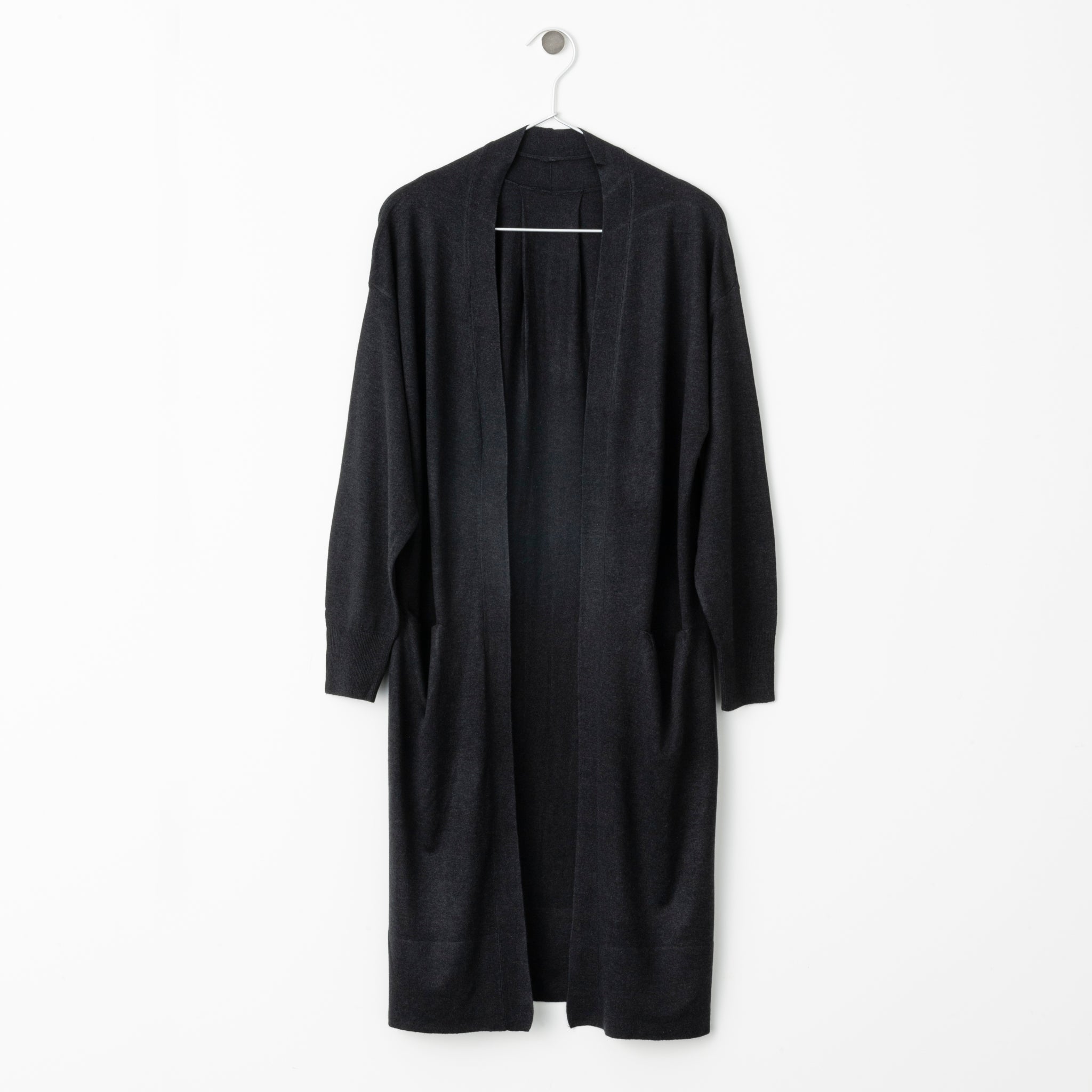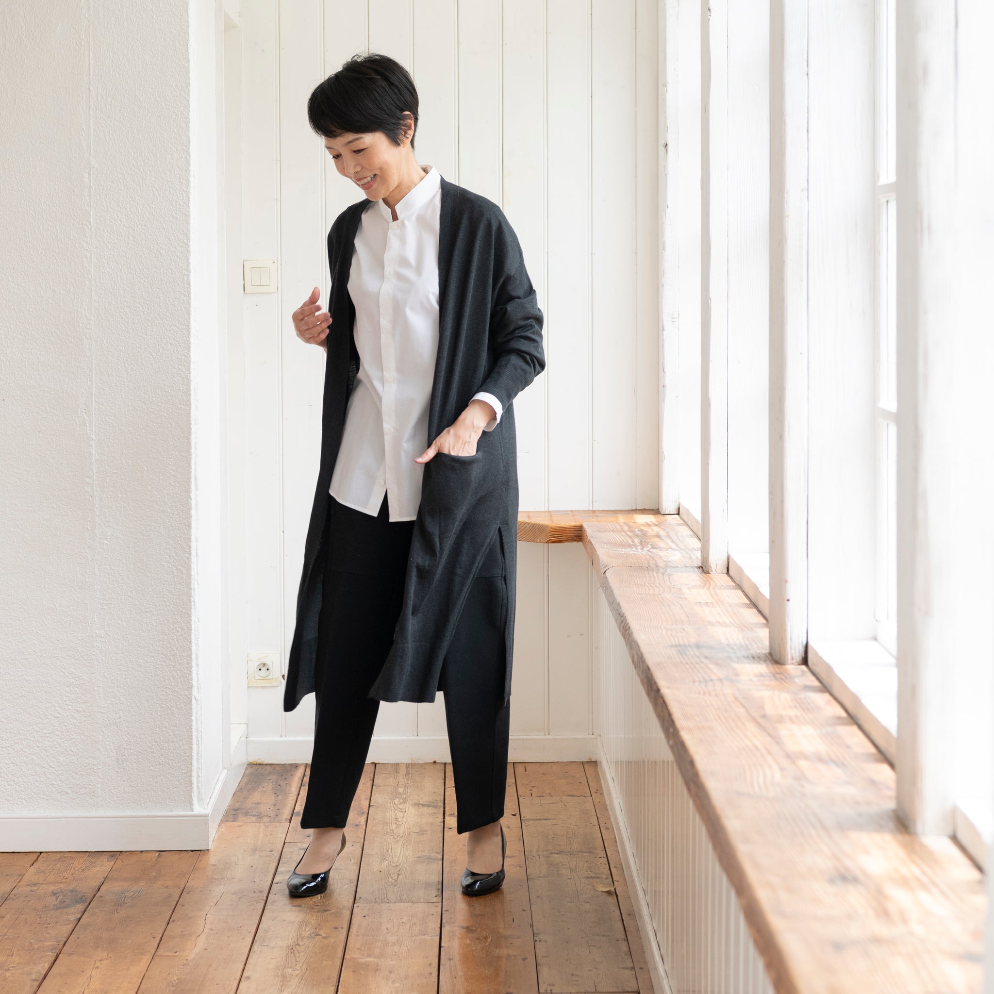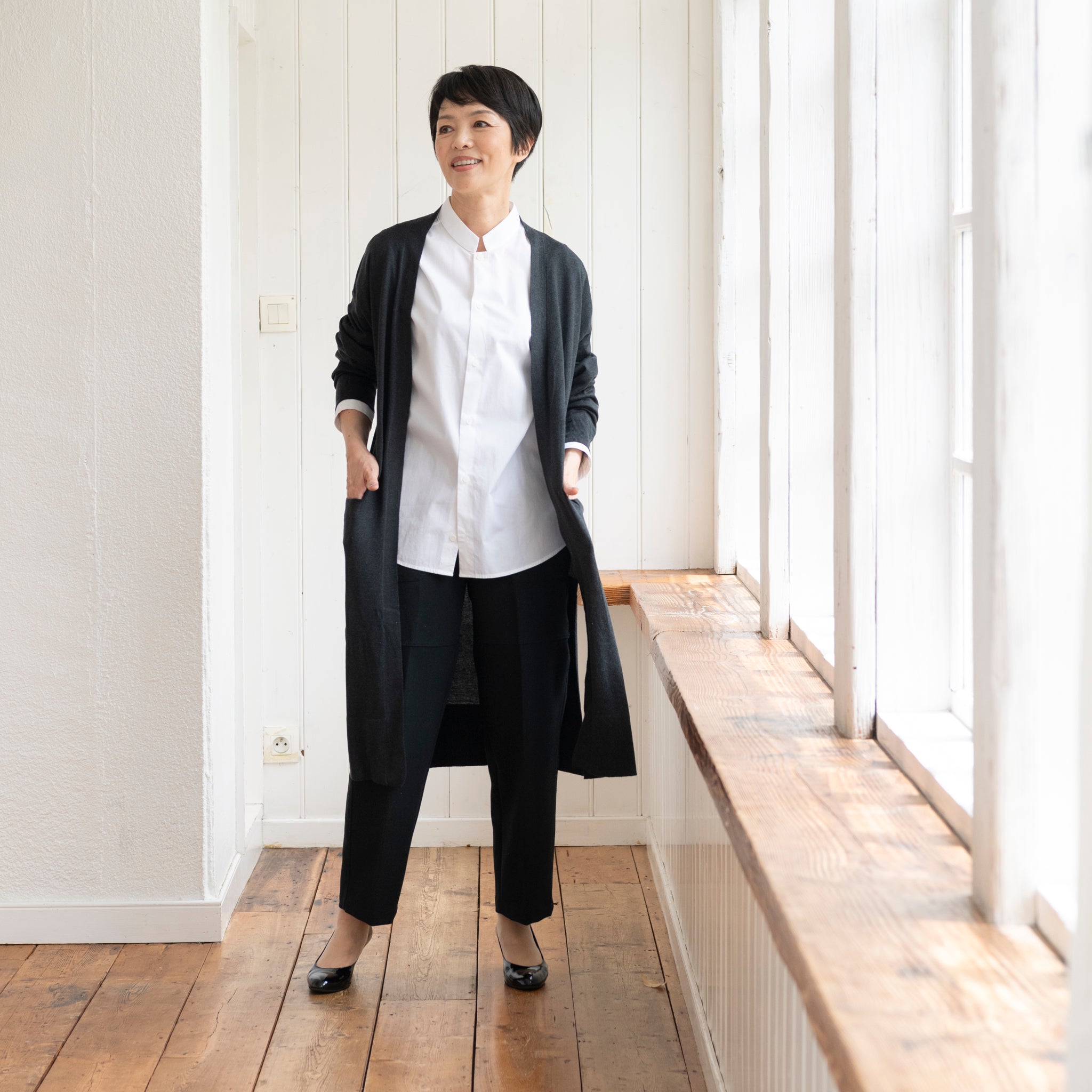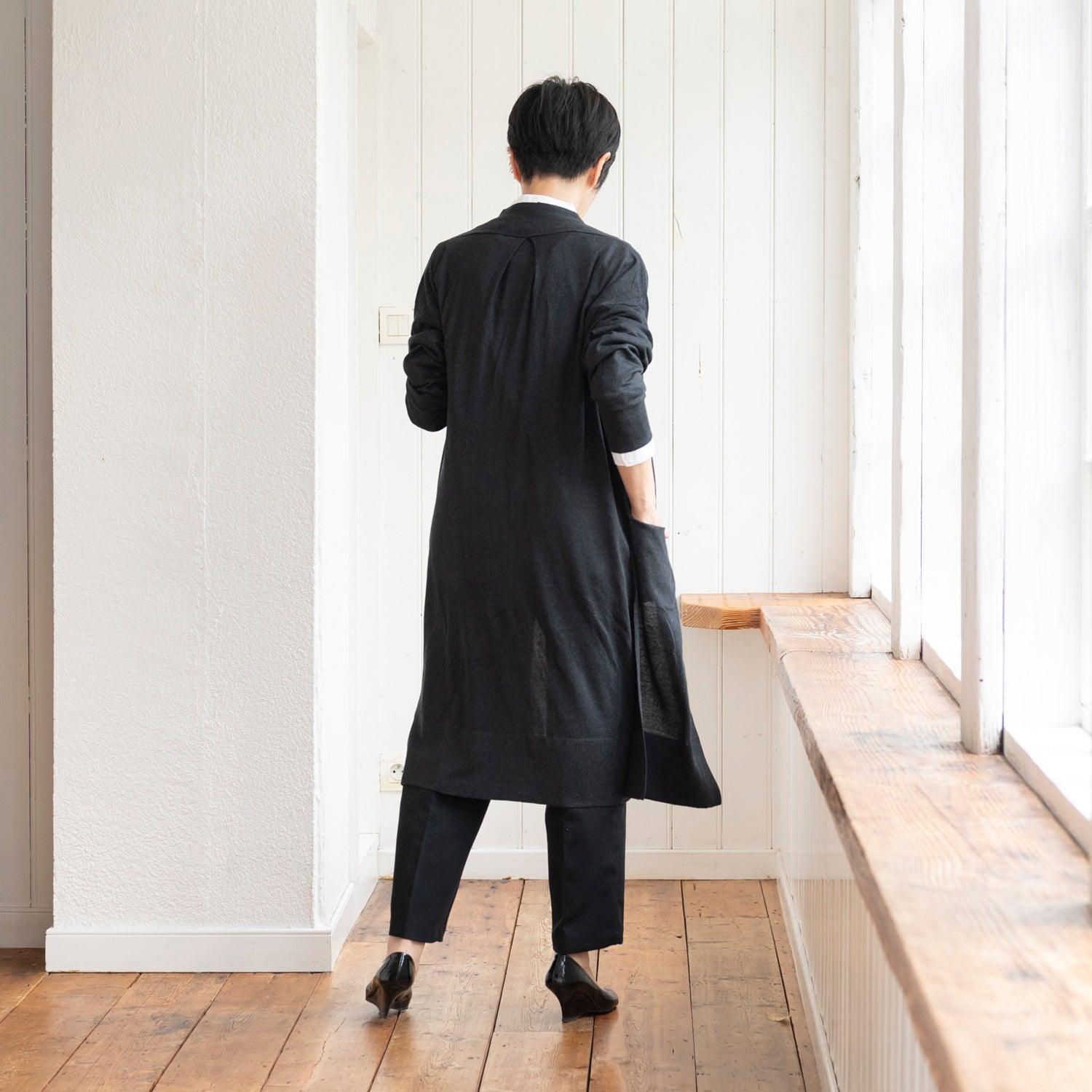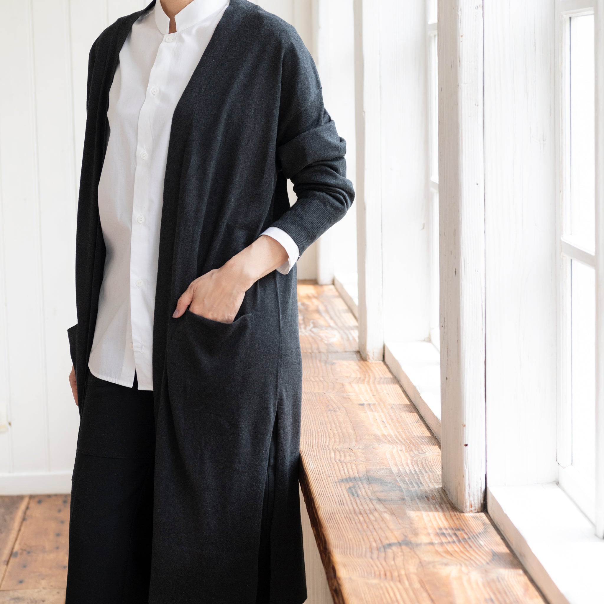 素材がいいからデザインはシンプル一見するとシンプルなロングカーディガン。でも、その真価は羽織った瞬間にわかります。シルク100%ならではのなめらかさとエアリー感がもたらす至高の着心地。動くたびに優雅に揺れる裾は大人の品格を醸し出します。パンツにもスカートにもワンピースにも合い、夏涼しく冬温かい、一年中出番の多い頼れる一枚。「幸せをまとう」感覚をぜひ味わってください。・シルク100%の天竺ニット・スラリと見せる縦長ライン・歩きやすい大胆スリット・アームホールゆったり・両サイドポケットつき・タックで後ろ姿を表情豊かに・薄手だからたたんでバックに入る【商品番号:287】シルク100%のロングカーディガン/チャコールグレー====================サイズ:バスト106×身丈102cm、裄丈74cm素材:シルク100%仕入元:DRESS HERSELF/中国製==================== ※クリーニング推奨。または優しく手洗い(ネット使用)後陰干し ▼ペールブルーはこちらhttps://tomonote.shufunotomo.co.jp/products/607506