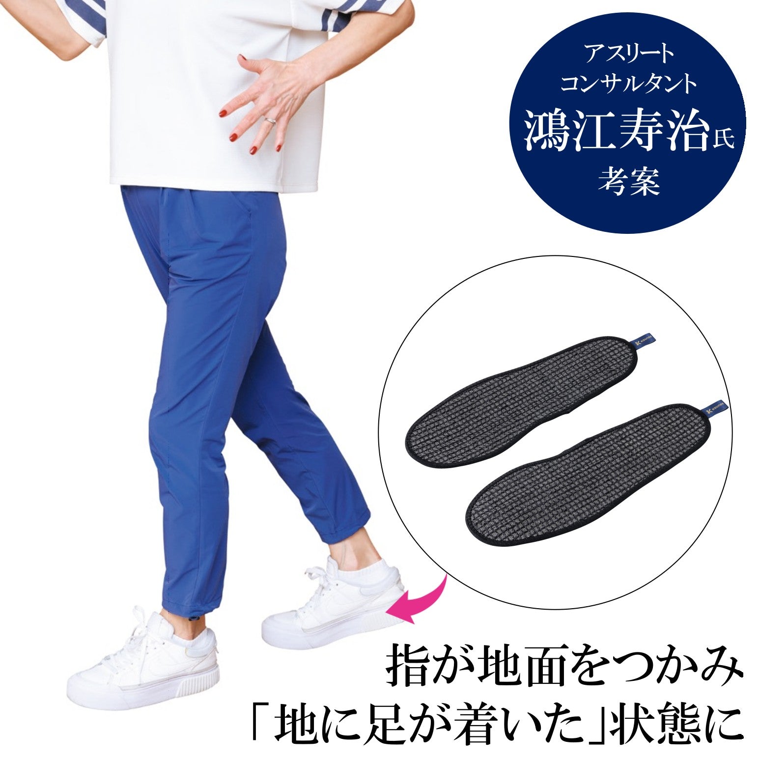 指が地面をつかみ、「地に足が着いた」状態に自分の体のタイプを知り、その個性を生かすことが健康づくりの第一歩。さらに、鴻江理論に基づいて開発された「パワーインソール」をプラスすれば、正しい動きが自然と身につき、健やかな体づくりにつながります。せっかく自分に合う体の動かし方をしても、体の軸がぶれていたのでは効果が半減。格子状のネット素材を用いたインソールには適度なすべり止め効果があり、体の軸がしっかり安定します。同時に足裏も刺激され、鈍感になっていた足裏の感覚や筋力もよみがえります。◆◆ゆうゆうフレンドが試してみました◆◆靴の中で足がずれないからしっかり踏ん張れます「かかと重心になりがちなのですが、指がしっかりとインソールをつかんでいる実感があり、足元に安定感が! ゴルフで使ったら、いいスイングができそうです」(星野さん)【商品番号330】22.0cm(全長:22.5, 最大幅:8.5)【商品番号331】23.0cm(全長:23.5, 最大幅:8.5)【商品番号332】24.0cm(全長:24.5, 最大幅:8.5)【商品番号333】25.0cm(全長:25.5, 最大幅:9)【商品番号334】26.0cm(全長:26.5, 最大幅:9)===================表地:ナイロン 裏地:EVAフチ巻き:ナイロン ポリウレタン仕入元:KOUNOE/日本製===================▼コウノエベルトシリーズ その他の商品はこちら骨盤用レギュラー肩用ベルト膝用ベルト