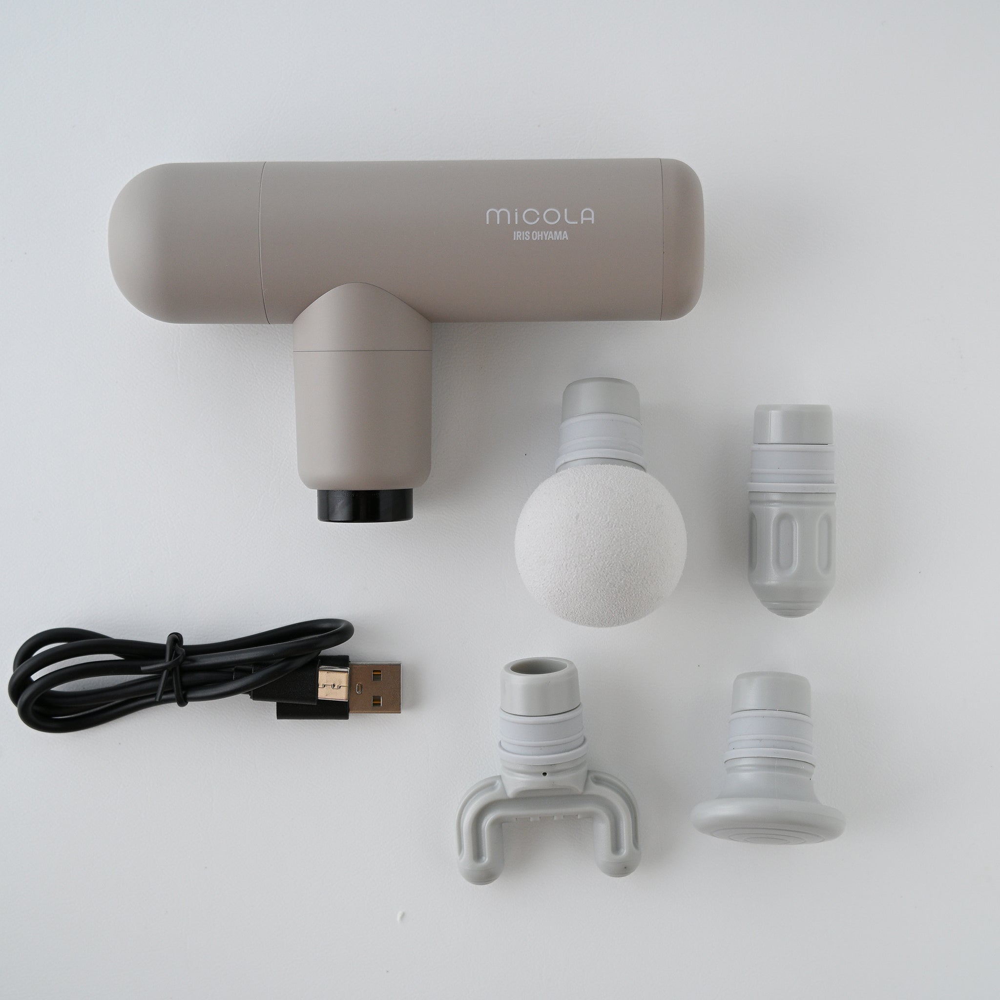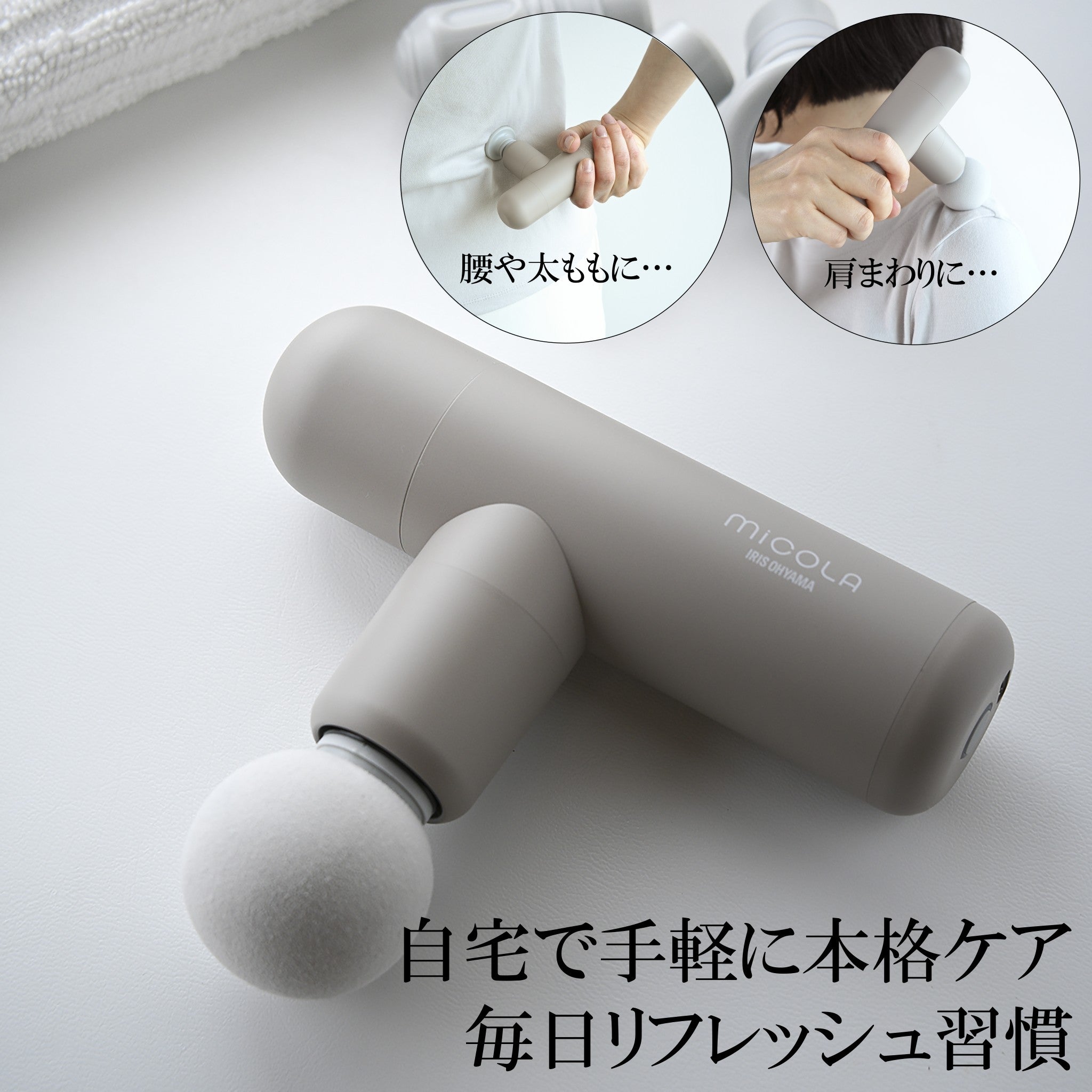 自宅で手軽に本格ケア。毎日リフレッシュ習慣MiCOLA(ミコラ)「ビューティーケアガン」は、自宅で簡単に本格ケアを取り入れられるコンパクト美容・健康アイテムです。約255g とスマートフォンほどの軽さで持ち運びもラクラク。毎日のリフレッシュ習慣に取り入れやすいです。4段階振動で、球形・平形・円柱形・U字形の4種類のアタッチメントを使い分けることで肩・腰・脚など全身を効率的にケア。静音設計なので夜間でも使用でき、フル充電(USB Type-Cに対応)で最大約6・5時間の連続稼働、さらに10分自動オフ機能までついています。収納ポーチもあり、持ち運びも便利。デスクワーク後の肩凝りから、家事による腰の疲れ、美容タイムの血行促進まで、幅広く活躍。自分用はもちろん、ギフトにもおすすめの一台です。●肩まわりやデコルテを優しくケアしたいときには球体を使用●腰や太ももなどの大きな筋肉をケアしたいときは平形を使用●これだけのアタッチメントや機能が搭載されているのにコンパクト