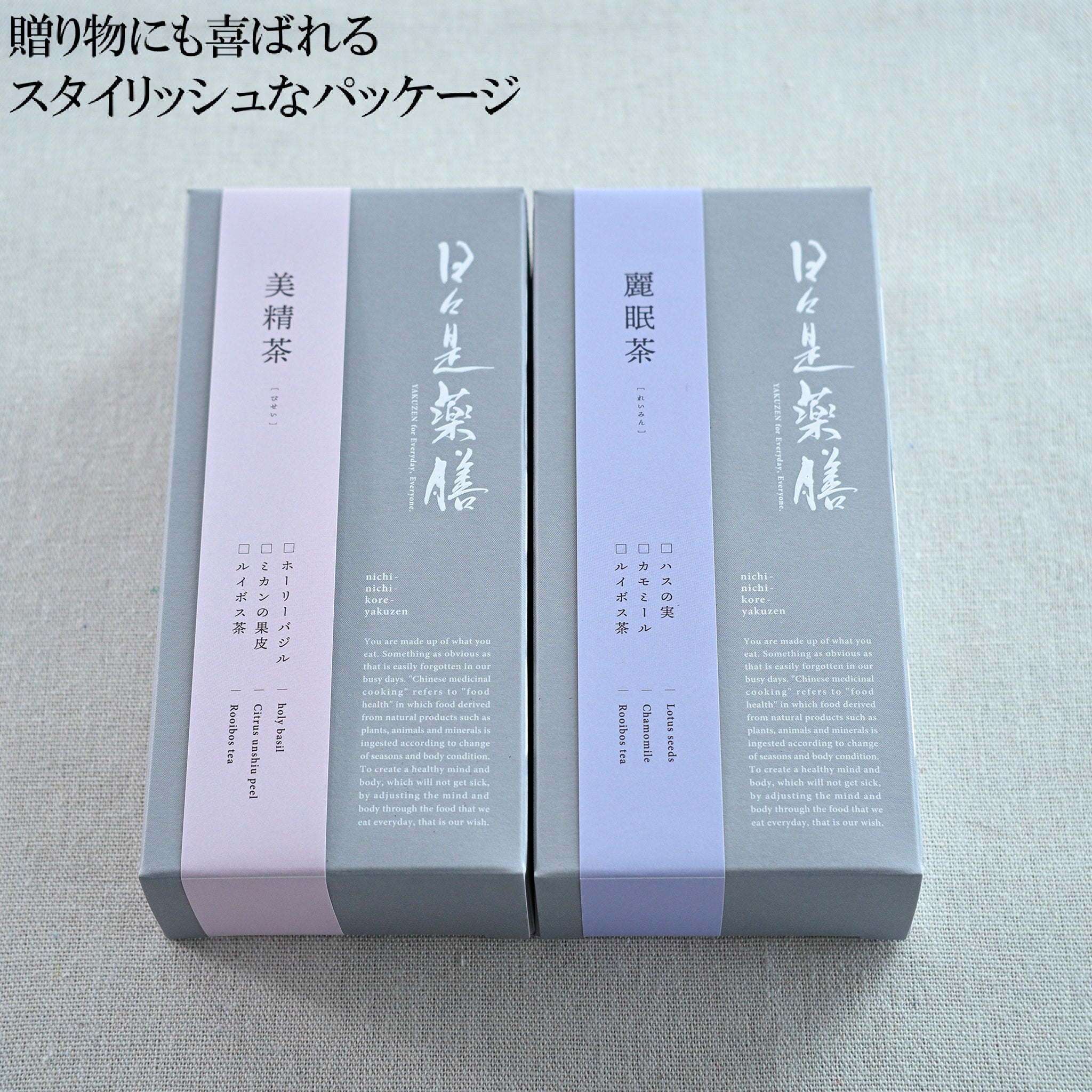 おいしいから毎日続けられるティーバッグで手軽に楽しめ、そしておいしい日々是薬膳(にちにちこれやくぜん)の薬膳茶が〈ゆうゆうオリジナル〉セットとして登場。ノンカフェインで体にやさしい「美精茶」と「麗眠茶」を組み合わせた〈ノンカフェインセット〉をご用意。日々是薬膳のお茶は「おいしいから続けられる」と評判。ホーリーバジル(トゥルーシー)と陳皮(みかんの果皮)をブレンドした「美精茶」は爽やかでスッキリとした飲み心地。どれも毎日の暮らしに自然に溶け込むおいしさです。さらに、ティーバッグタイプだから準備も片づけも簡単。忙しい日常でも気軽に薬膳を取り入れられるのがうれしいポイントです。おいしさと手軽さを兼ね備えた薬膳茶、毎日の習慣に取り入れてみませんか。◆◆作り手のこだわり◆◆国際中医薬膳師・薬膳料理家栫 英子さん薬膳をもっと身近に、日々の暮らしに気軽に取り入れてほしい、そんな思いから2019年に誕生しました。商品化にあたっては、試飲を重ねて配合率を何度も調整し、誰もがおいしいと感じられる味を徹底的に追求しました。企画から完成まで約1年費やしました。ブランドの最大のテーマは「効能とおいしさの両立」です。薬膳はおいしくなければ体の中の気が巡らず、本来の力を発揮できません。だからこそ、生薬の量を減らすことなく、味わいと効果のバランスを追求しています。【商品番号343】ノンカフェイン茶2種セット(美精茶&麗眠茶===================化粧箱サイズ(約):8 × 17 × 4cm内容量:各ティーバッグ約2g×10 袋原材料:美精茶/ホーリーバジル(インド産)、みかんの果皮(日本産)、ルイボス茶(南アフリカ産)麗眠茶/ルイボス茶(南アフリカ産)、カモミール(エジプト産)、蓮の実(中国産)仕入元:日々是薬膳/日本製===================※求める効能に合わせて、1日1~2パックを目安にお楽しみください。▼人気ブレンド茶2種セット(巡気茶&排毒茶)もございます!