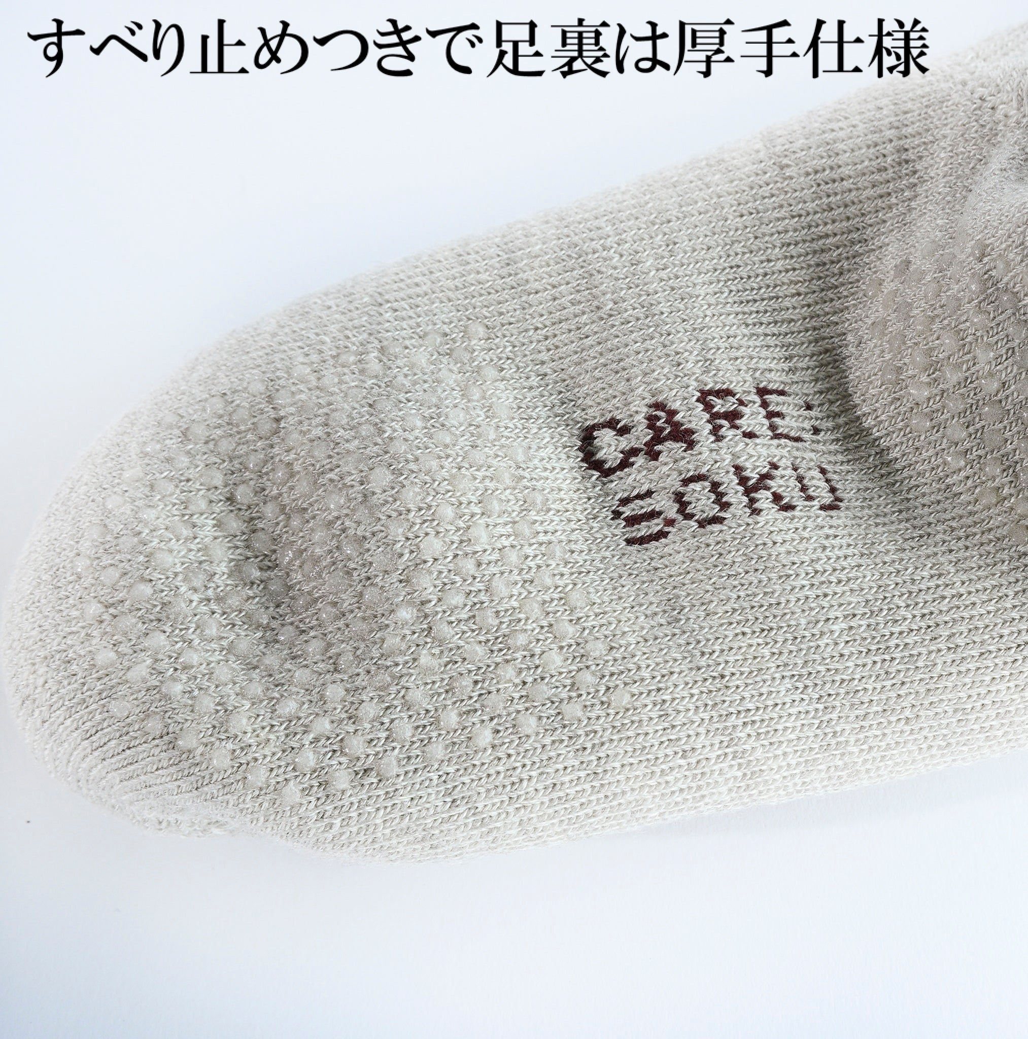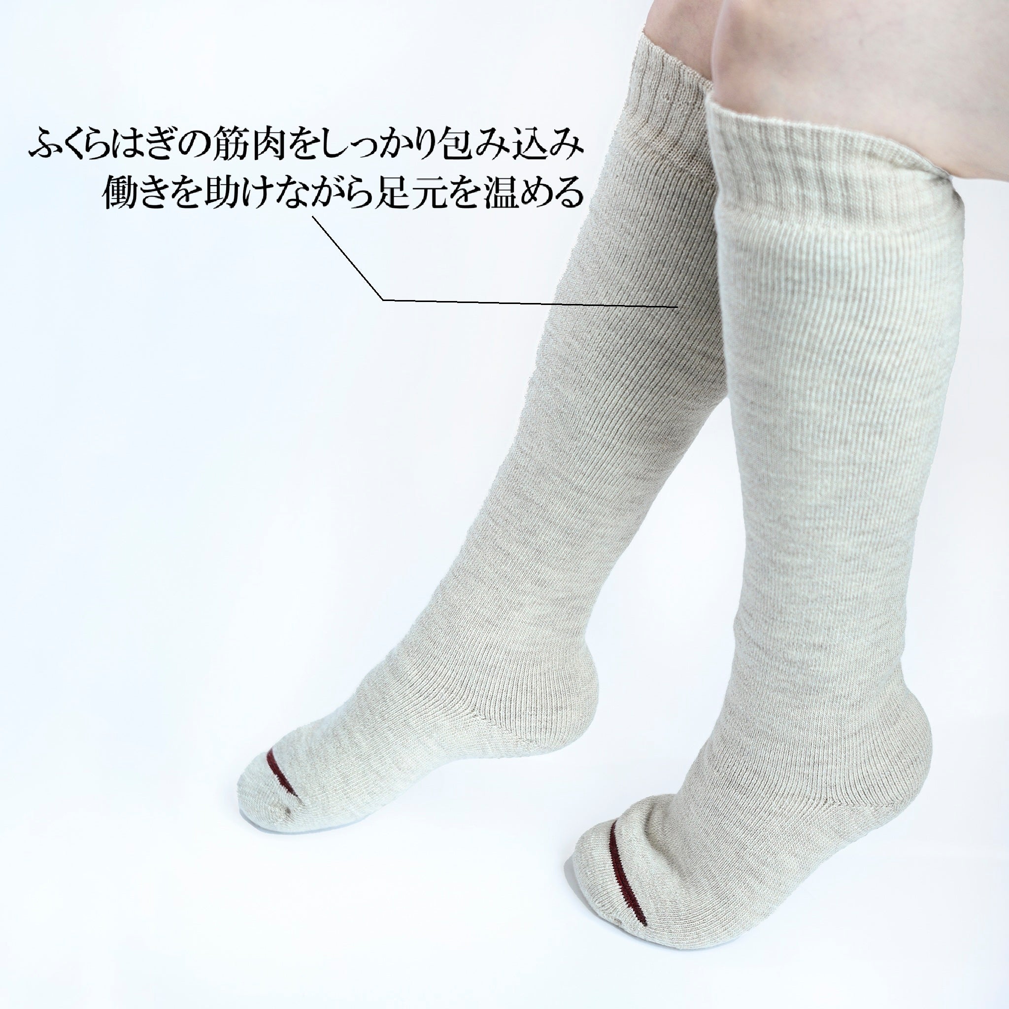 セーター2着分の糸で、家中どこでも足ぽかぽか足元からじんわり温まる“まるで足湯設計〟のソックス「あたためる おうちロング」は、ふんわりと包み込むようなはき心地で、湯上がりのようなぬくもりを長時間キープします。特許取得の二重パイル構造が冷たい外気をしっかり遮断し、足本来の熱を逃さず保温。さらに吸湿発散性と保温力に優れた独自素材を採用しているため、ムレにくく快適に過ごせます。1足にセーター2着分の糸を贅沢に使用した極厚のふっくら編地は、家中どこでも暖かさを保ち、抜群のクッション性で体圧を分散。長時間の着用でも体への負担を軽減してくれます。●ふくらはぎの筋肉をしっかり包み込み、その働きを助けながら足元を温める●すべり止めつきで足裏は厚手仕様●一般的な靴下として初めてDoctorMe医師推奨マーク(※)取得※CareNetグループ登録医師に推奨意向度調査を行い、一定の基準を満たした場合にのみ付与される推奨マーク2022年9月Docotor Me調べ、医師110名へのアンケートより、106名が周囲の人に「ぜひ薦めたい」「薦めたい」と回答【商品番号:346】グレー【商品番号:347】ベージュ====================サイズ:フリー(22-25cm)素材:アクリル、ウール、その他仕入元:山忠/日本製====================
