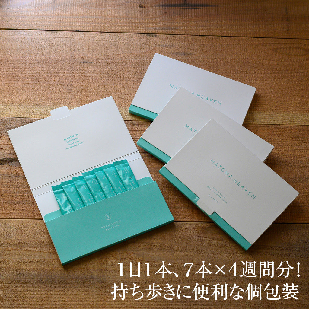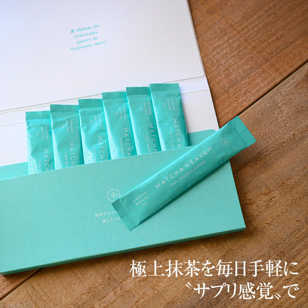 極めて珍しい単一品種のオーガニック抹茶 静岡県掛川市。日本では極めて珍しいオーガニック単一品種の抹茶ブランド、MATCHA HEAVEN(マッチャヘブン)。茶葉の栄養を丸ごと摂取できる天然のサプリメント感覚で、体を内側から整えます。水にサッと溶ける細かい粒子なので、マイボトルに水やお湯と入れて振るだけで、香り豊かな抹茶が完成。酸化を防ぐ個包装だから持ち歩きにも便利。1日1本を目安に、7日分×4パック。1カ月の養生習慣としてお試しください。●茶道家も感嘆させる高品質の極上抹茶が、おしゃれに手軽に携帯できる形に。ペットボトルやマイボトルで抹茶の恵みを摂取!●さっと溶ける粒子だからボトルに水と入れて振るだけで完成!●HOTでも◆◆作り手のこだわり◆◆代表取締役母里 比呂子さん(MATCHA HEAVEN)生産者が誇りを持ってつくった日本茶の価値を最大化したい―そんな思いから6 年前にブランドを立ち上げました。独自に開発した超微細粒子は水に溶けやすく、ボトルに入れ、シャカシャカ振るだけでダマになりません。また、抽出するお茶と違い、茶葉を丸ごと飲むので、ビタミンC や食物繊維、カテキンなどの栄養を余すところなく摂取できます。私自身も肌荒れがしにくくなり、お客さまから寄せられる声でも便秘改善や脂肪燃焼の実感をいただいています。【商品番号367】====================原材料:有機碾茶内容量:(1パック当たり)14g(2g×7本)賞味期限:約10カ月仕入元:MATCHA HEAVEN/日本製====================▼サクっとほどけるサブレMATCHAHEAVEN日本茶クッキーアソートBOXはこちら